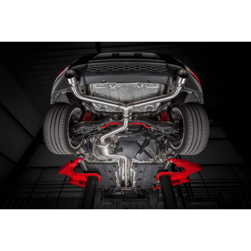 Le système d'échappement Catback APR personnalise l'apparence, le son et les performances de votre véhicule. Les composants sont magnifiquement fabriqués à la main en acier inoxydable T304 avec des soudures TIG étonnantes tout au long. Nos silencieux brossés à finition droite sont configurables selon vos souhaits, lissant la note d'échappement pour un grognement profond, sans ajout de restrictions, de crépitement ou de bourdonnement. Des supports robustes de haute qualité et des colliers de style OEM maintiennent le système solidement en place, rendant l'installation ou le retrait un jeu d'enfant, et l'ajustement simple mais précis. Un diviseur arrière moulé de 3" à double sortie de 2,5" crée une transition ultra-smooth, évacuant régulièrement les gaz d'échappement du système, tout en ayant une apparence soignée sous le pare-chocs arrière. Enfin, des embouts d'échappement polis amovibles de 4" complètent le système, ajoutant une touche élégante inspirée du sport automobile à l'arrière du véhicule.